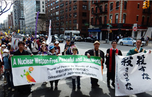 4月26日午後2時から行われた平和行進では、日本から参加した代表団1058名の他にも世界各地から多くの市民がユニオンスクエアに集合し、それぞれの思いをこめたプラカードや横断幕、タペストリーを持ち、沿道の人たちに核廃絶を訴えながら行進しました。沿道の人たちも快く手を振って応えてくれていました。そんな中で私が特に頼もしく思えたのはパレードの中に若者の姿が多く見かけられ、積極的にビラを手渡し、署名を訴えながら明るく行進する姿を見て、我々が勇気をもらえる頼もしさを感じました。